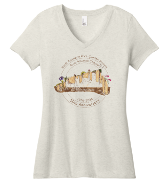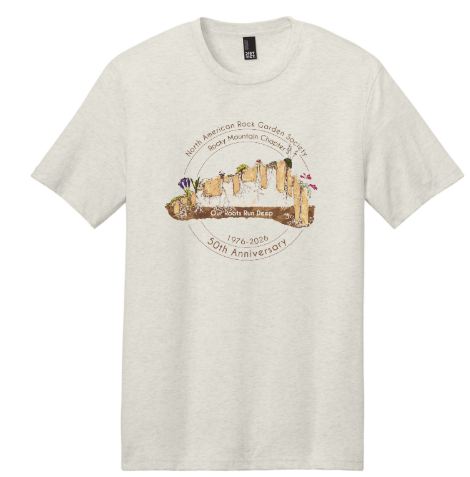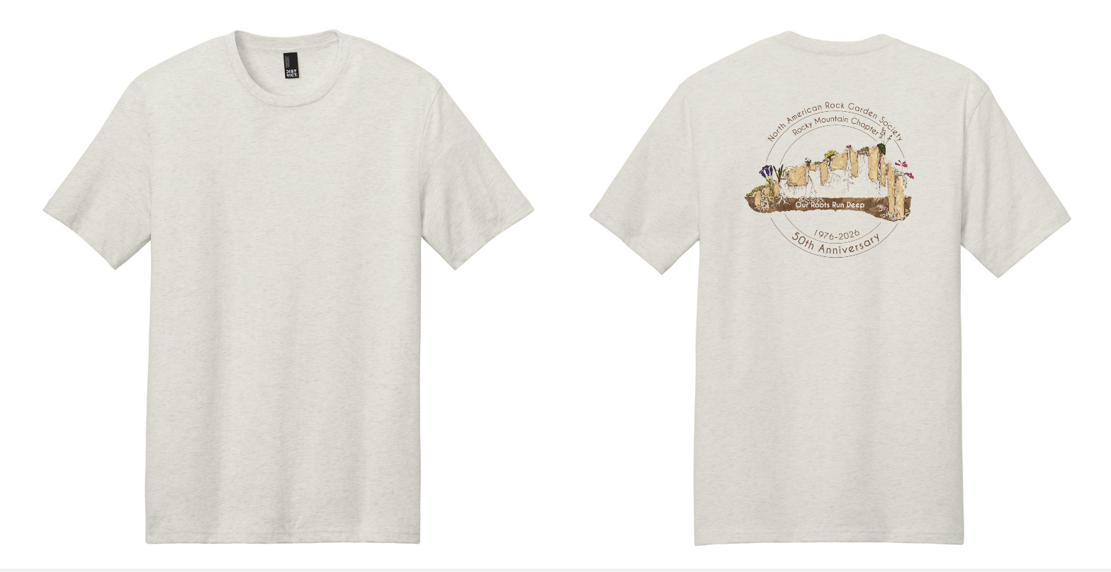 RMC chapter is offering a T-shirt designed for our 50th anniversary. The shirt highlights our society’s dedication to alpine plants and rock/crevice gardening. The shirt will be available in white or oatmeal color and are 100% cotton. Women will have a V-neck option, and a round neck will be available for everyone in unisex sizes. We will be offering several shirts for people to look at for sizing help at our next 3 meetings.